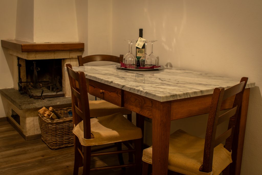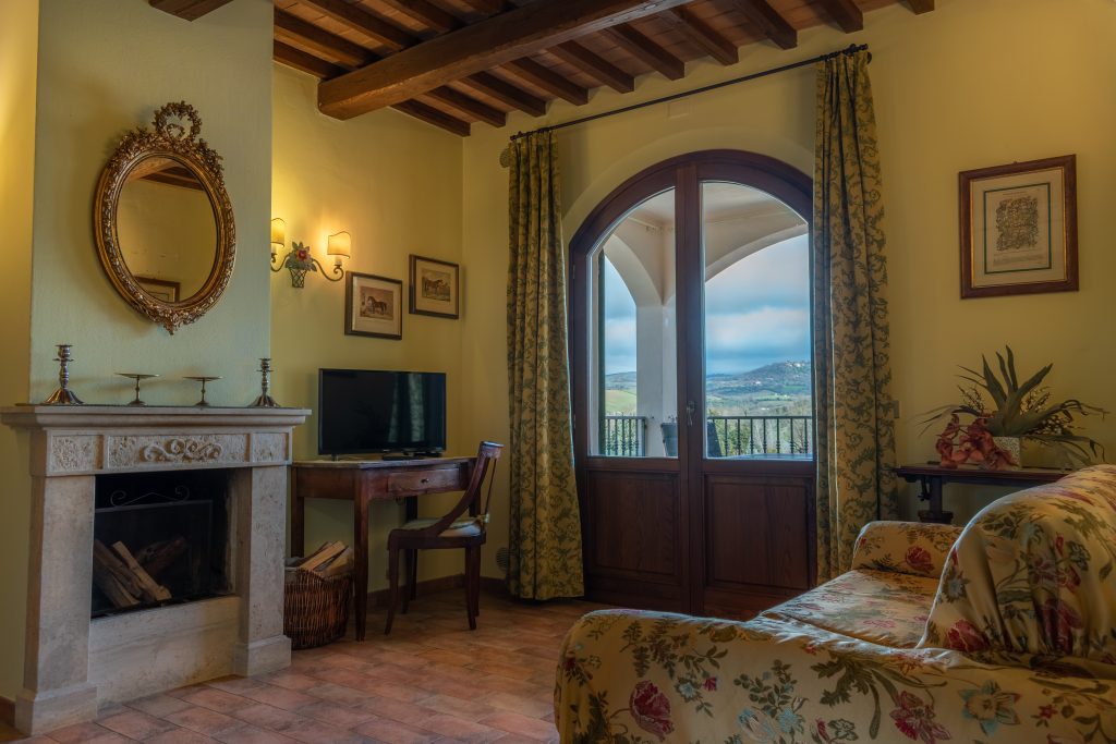 Suite calda e accogliente, con salotto con camino e spazi pensati per il relax.